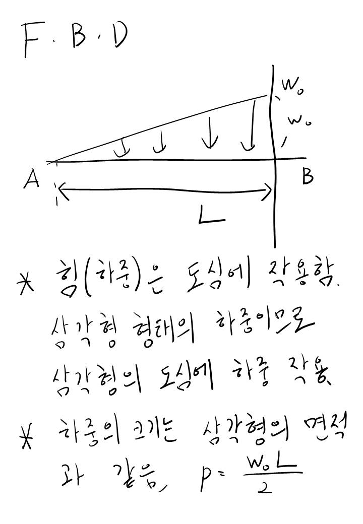 이 그림은 단위하중에서 하중으로 보를 변환한 모습입니다. 실제 보에 작용하는 하중은 wL/2 이며 하중이 작용하는 위치는 삼각형의 도심부... 즉 A점에서 x방향으로 2L/3 지점 떨어진 곳이네요.