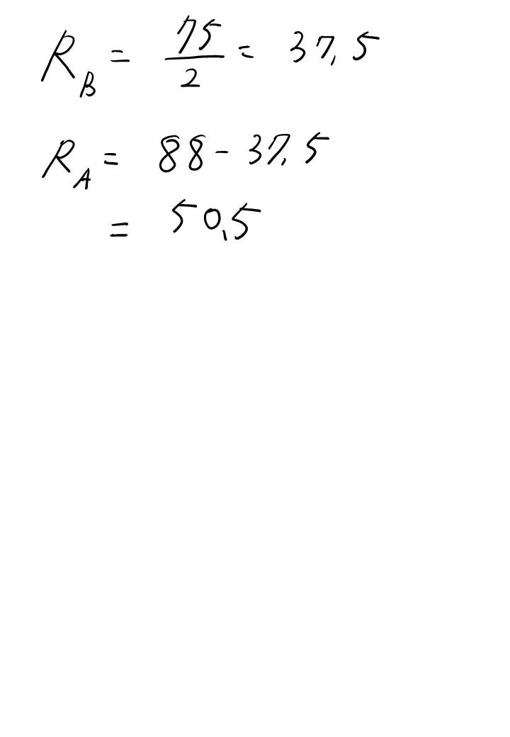 여기까지 해서 A, B 점의 반력을 구했습니다. 반력을 구하는데 총 두 개의 방정식을 사용하였네요. 첫 번째는 힘의 평형 방정식을 이용했고, 두 번째는 모멘트 평형 방정식을 이용했습니다. 미지수가 두 개 (Ra, Rb) 였고 방정식도 두 개였으니 풀릴 수 있었네요.